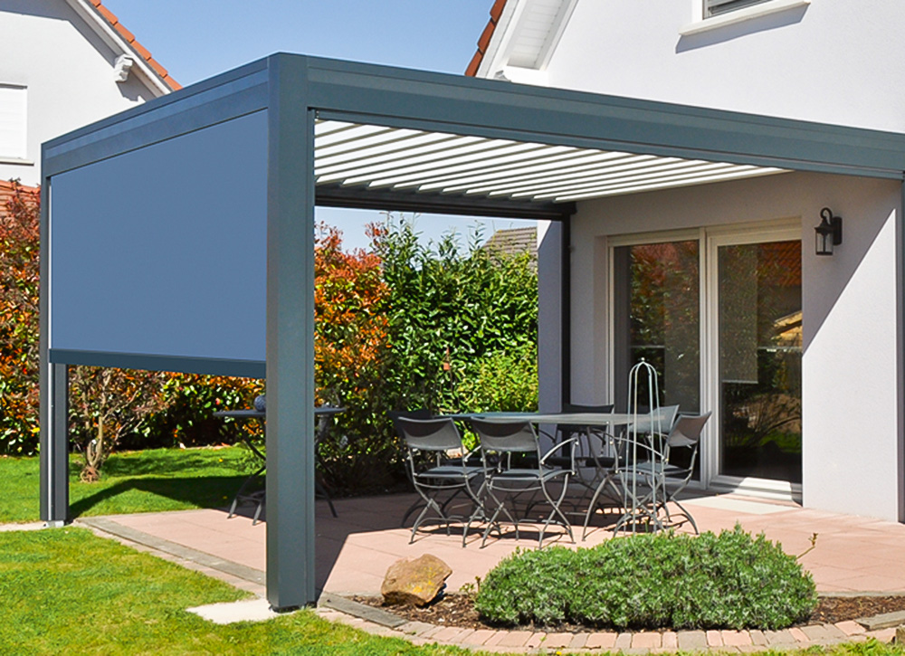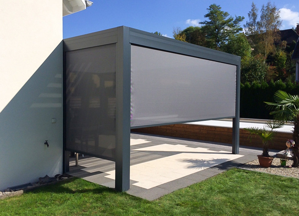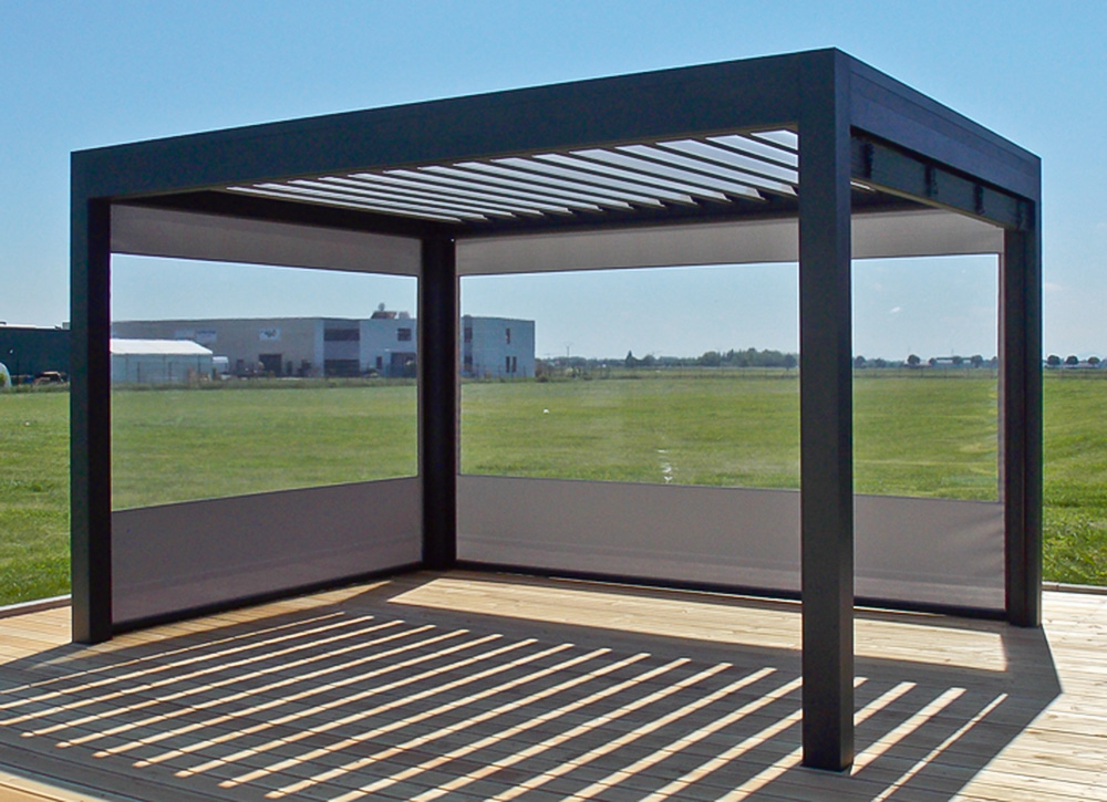 Die Pergola OPEN besticht durch ihr formschönes Design und innovative Konstruktion. Um 160° verstellbare Lamellen ermöglichen umfassende Lichtkontrolle. Das Modell ist wandmontiert oder freistehend erhältlich und kann modular kombiniert werden. Flachdach-Pergolen mit Regenrinnen sorgen für Wasserablauf. Zahlreiche Optionen wie integrierte LED-Beleuchtung und Beheizung sind verfügbar.